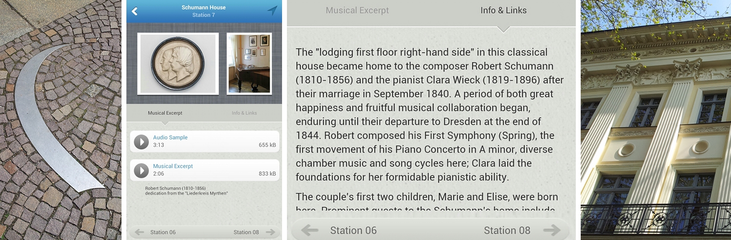 Links: straatmarkering Leipziger Notenspur; midden: de mobiele app van het Leipziger Notenspur (een screenshot en een uitsnede van een screenshot); rechts: het Schumannhaus.