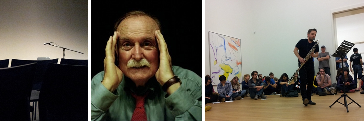 Links: Teijin Auditorium na de performance van Alvin Lucier. Midden: Alvin Lucier (ouder beeld). Rechts: Gareth Davis voert Luciers stuk ‘In Memoriam Stuart Marshall’ uit. Stedelijk Museum Amsterdam, 18-10-2014.
