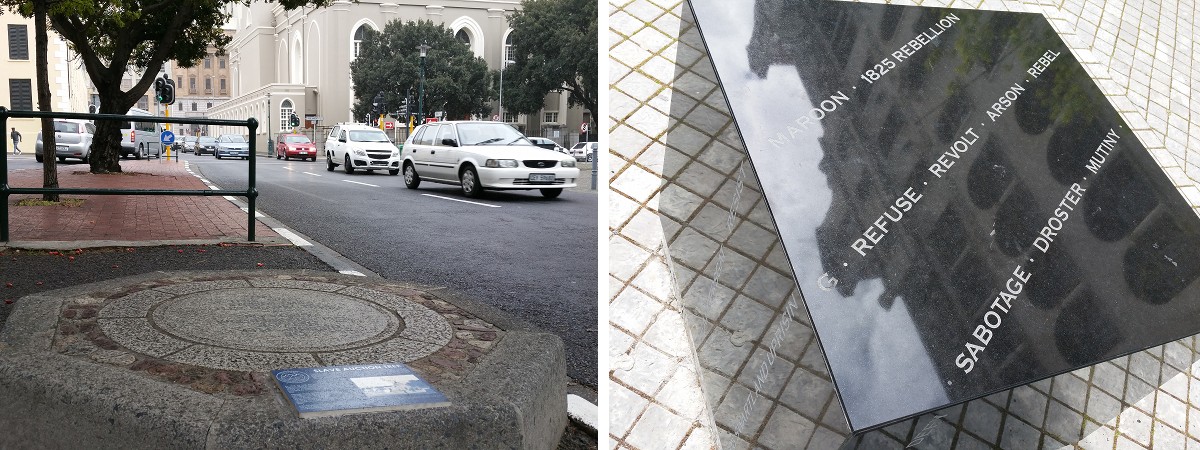 Links: ‘Slave Tree’ in Spin Street. Rechts: een van de blokken van het ‘Slave Monument’ op Church Square.