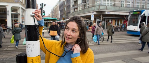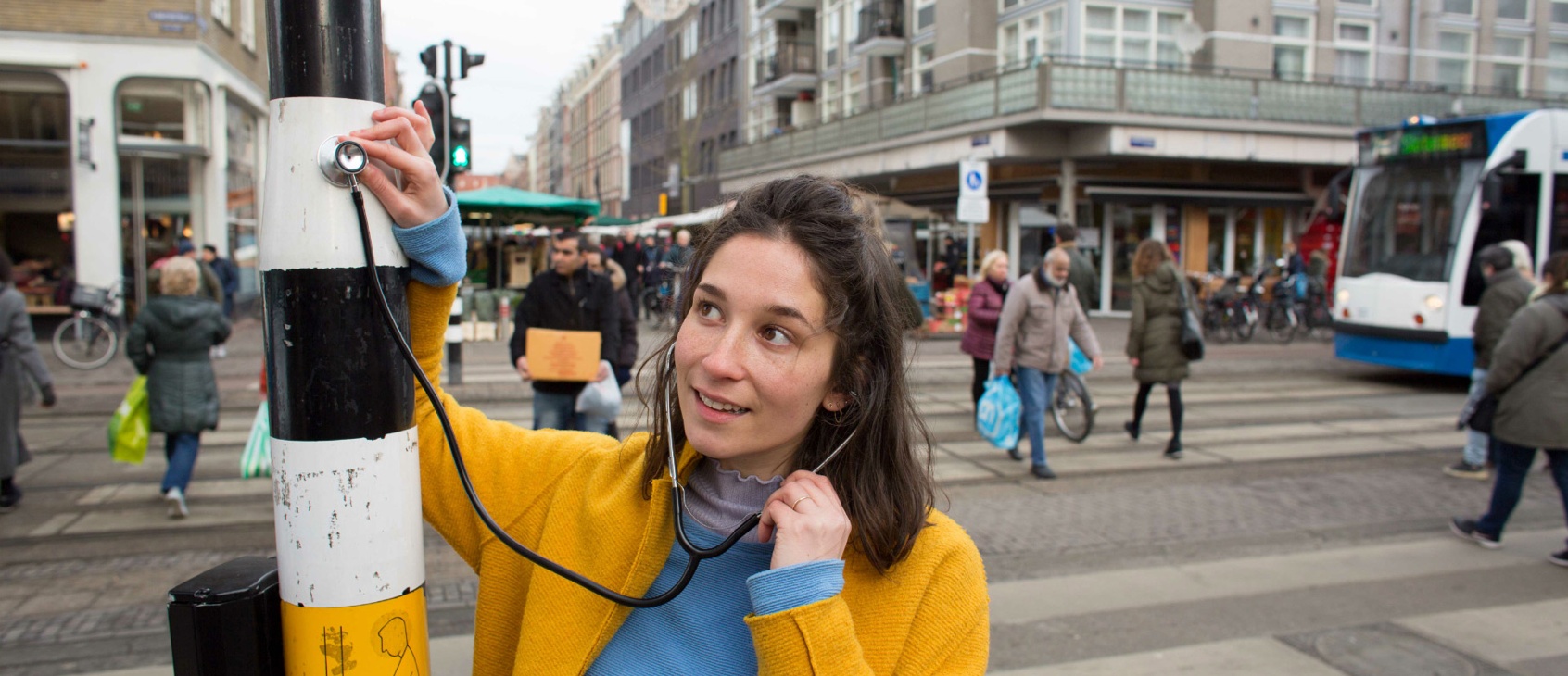 Hoe klinkt de Kinkerbuurt eigenlijk voor mij? Ik woon er niet, maar kom er regelmatig. Dan luister ik vaak niet eens bewust, laat staan dat ik de geluiden analyseer. Meestal luister ik instrumenteel. Om te horen of er verkeer aankomt voordat ik de Kinkerstraat oversteek. Om te horen of ik degene ben die op de Ten Katemarkt wordt aangesproken of iemand anders in mijn buurt. Maar vorige zomer, op World Listening Day, liep ik met Soundtrackcity en componiste Anne Wellmer een geluidswandeling door de buurt. We bewogen ons met een groep langs een vooraf uitgestippelde route. Zonder koptelefoons, zonder vooraf opgenomen soundtrack, zwijgend, om zo beter te kunnen luisteren naar de geluiden van de stad. Aan het begin, op een bruggetje in de Kinkerstraat, hoorde ik in eerste instantie een constant geruis van verkeer, vogels in de gracht, dan pratende voorbijgangers, waarbij ik onwillekeurig luisterde naar wat ze zeiden. Dan, nog steeds op de brug, wat meer aandacht voor andere geluiden. IJsblokjes in een café frappé, van iemand in het zonnetje. In beweging gebracht en hoorbaar gemaakt door een rietje. Daarna, inmiddels zelf in beweging, het rammelen van de kettingkast van een op de straatklinkers voorbij komende fietser, het geluid van een metalen kettingslot waarmee een fiets vastgezet wordt. Later een symfonie van brekend glas in een glasbak, het doffe geluid van een kaatsende voetbal, zoemende koel- en afzuiginstallaties en onverwachtse stilte.